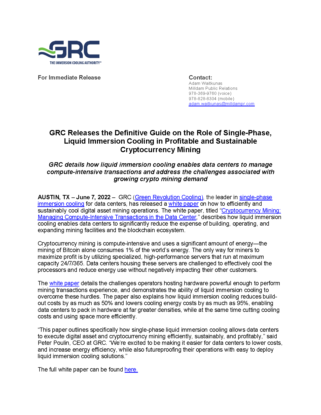 AUSTIN, TX – June 7, 2022 – GRC (Green Revolution Cooling), the leader in single-phase immersion cooling for data centers, has released a white paper on how to efficiently and sustainably cool digital asset mining operations. The white paper, titled “Cryptocurrency Mining: Managing Compute-Intensive Transactions in the Data Center,” describes how liquid immersion cooling enables data centers to significantly reduce the expense of building, operating, and expanding mining facilities and the blockchain ecosystem.