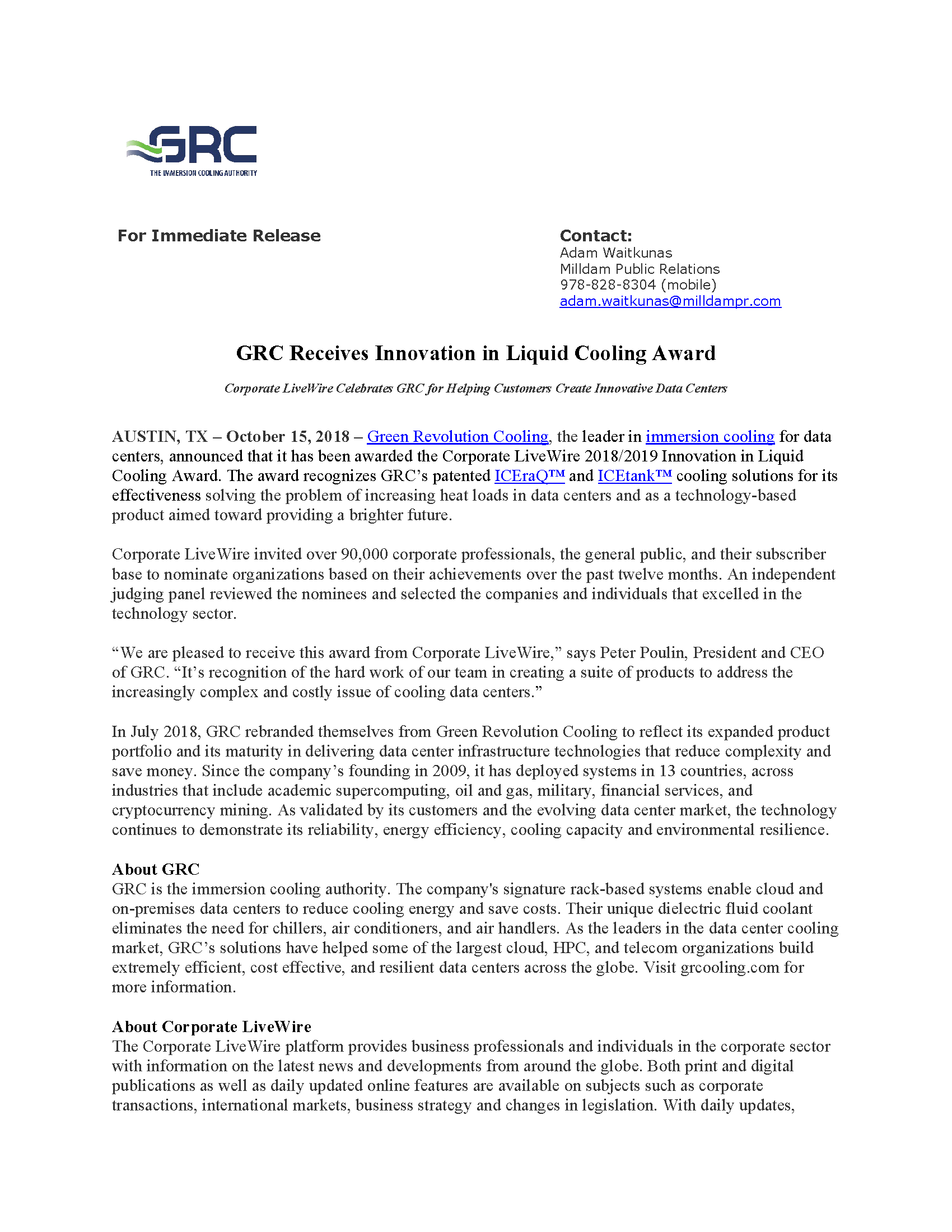 Green Revolution Cooling, Inc. (“GRC”) believes this information to be accurate; however, GRC does not make any representation or warranty, express or implied, as to the accuracy or completeness of any such information and shall have no liability for the consequences of the use of such information.