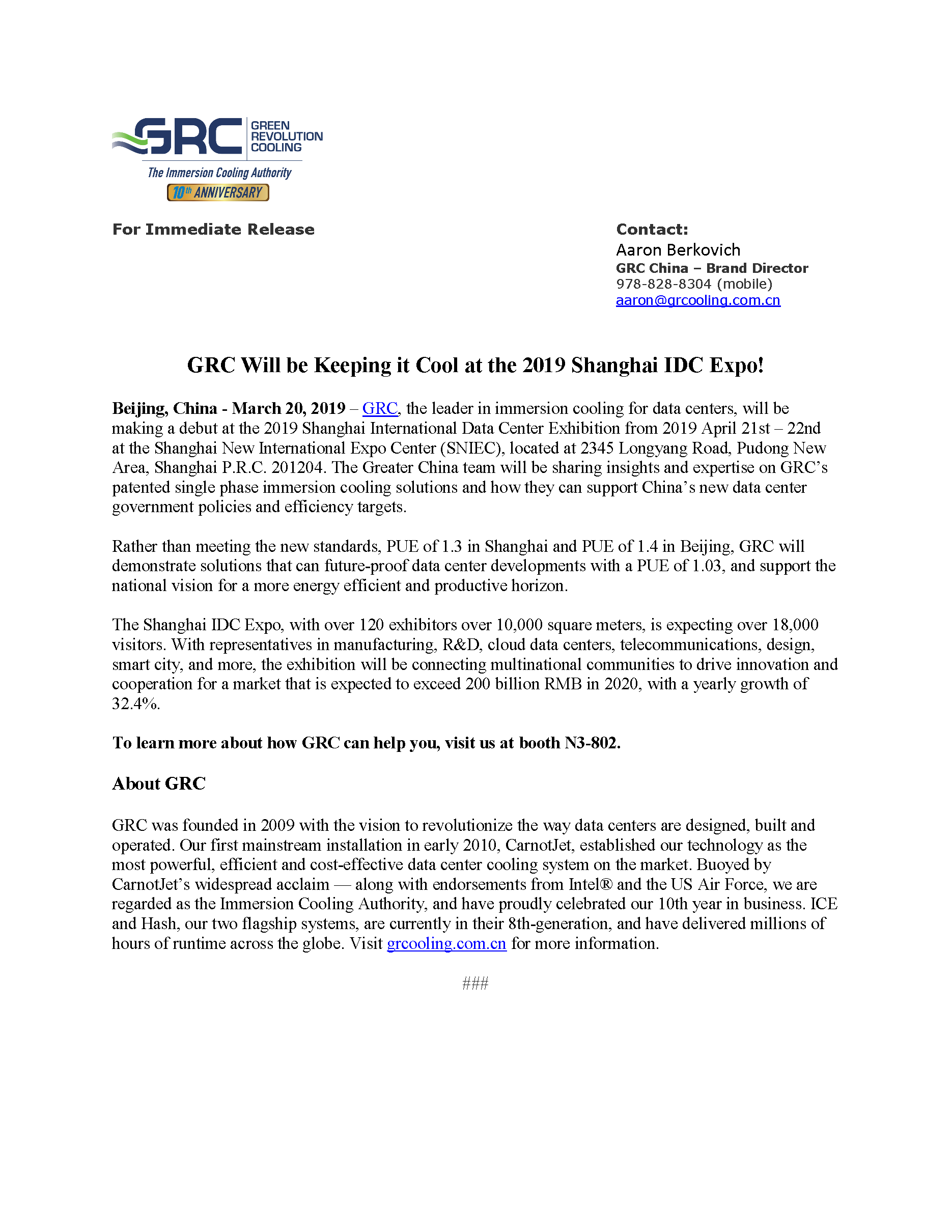 GRC Will be Keeping it Cool at the 2019 Shanghai IDC Expo!